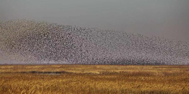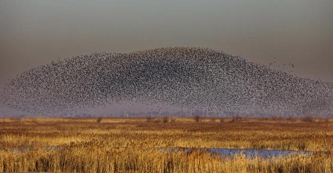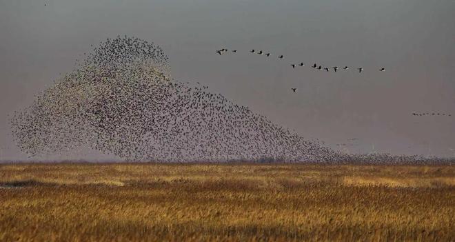 “起来啦!”2025年10月末,东营市滨海大道观鸟驿站,来自北京的摄影爱好者们的齐声惊叹,成为今冬黄河口“鸟浪”的首个网红热词。数十万只花脸鸭从山东黄河三角洲国家级自然保护区振翅腾空,宛若灵动流云,阵型变化多端,自天际由远及近。鸟群掠过游客头顶,振翅声交织成潮,如浪花拍岸,似千军过境。最令游客沉醉的,是鸟群时常幻化出惟妙惟肖的鲸鱼形态,头部、尾鳍、胸鳍轮廓清晰,凌空遨游的模样,恰如庄子《逍遥游》中“其翼若垂天之云”的意境照进现实。